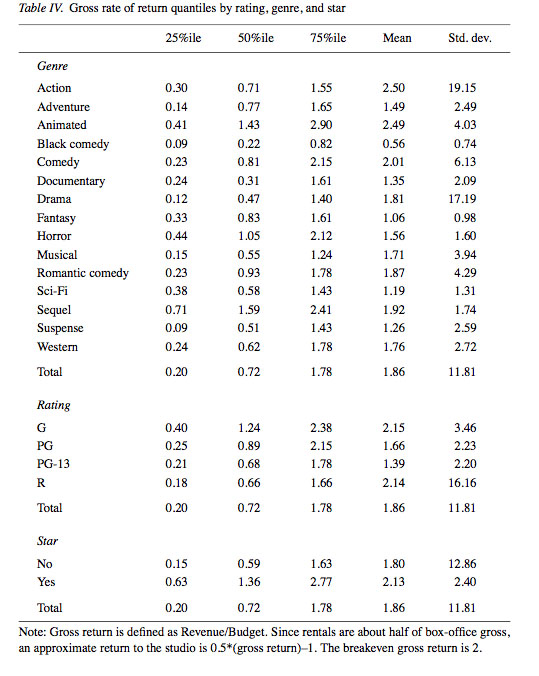 • Table from Artur De Vany and W. David Walls, “Uncertainty in the Movie Industry: Does Star Power Reduce the Terror of the Box Office?” Journal of Cultural Economics 23: 285–318, 1999.